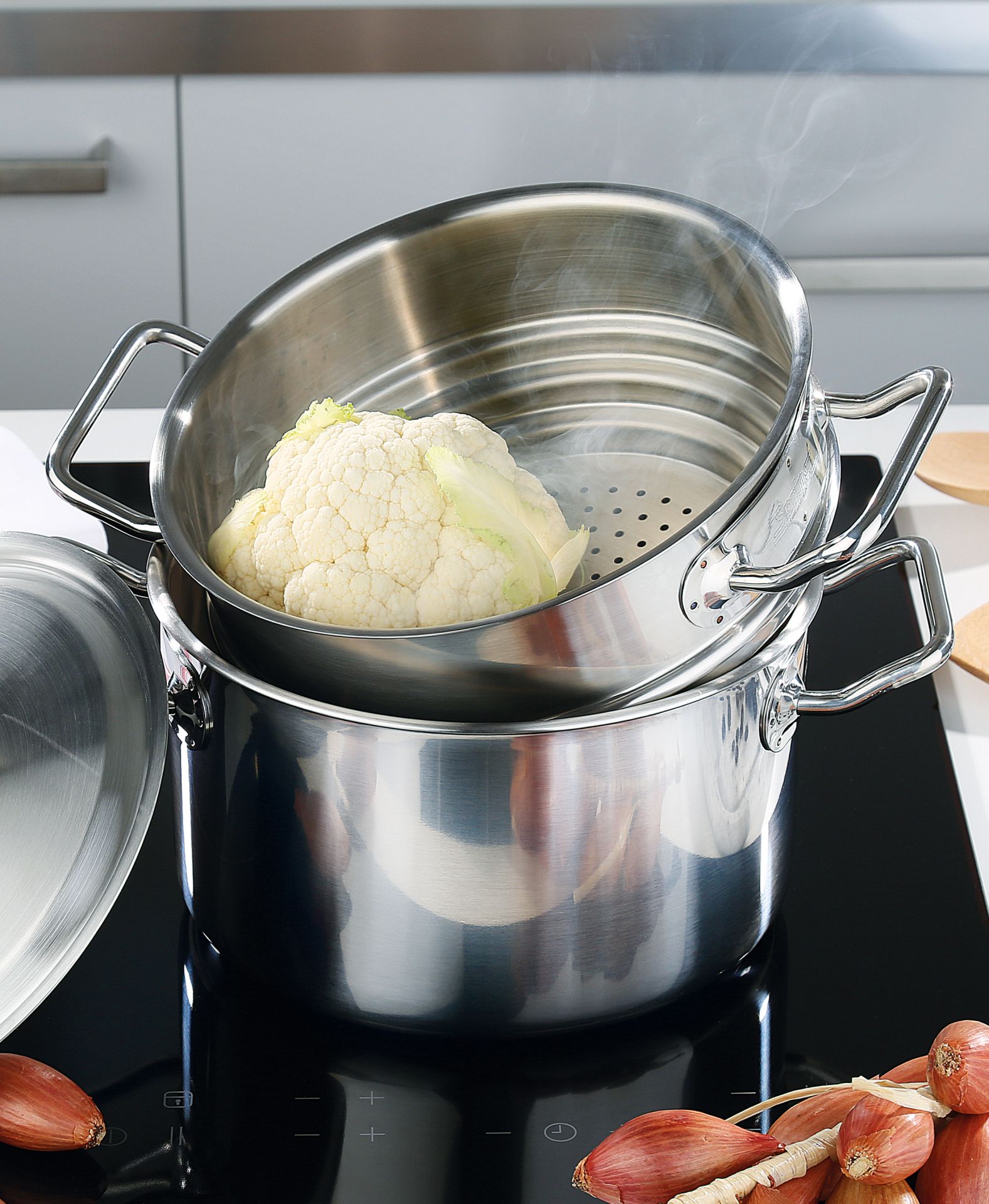 Das Dämpfen ist die wohl schonendste Zubereitungsart. Es wird Wasser in einen Topf gefüllt und darauf der Dämpfeinsatz gesetzt, ohne dass dieser in kontakt mit dem Wasser kommt. Wichtig ist, dass der Deckel unbedingt auf dem Topf bleibt, denn der Wasserdampf spielt bei der schonenden, fettfreien Zubereitung von Fischfilets, Fleisch und Gemüse die zentrale Rolle. Mit dem Dämpfaufsatz der Serie BRIGADE PREMIUM von Spring gelingt dies hervorragend, denn er ist passgenau für die Töpfe der Serie Brigade von 16 – 20 cm. Die Aromen können sich voll entfalten und Nährstoffe bleiben erhalten. Auch unterschiedliche Speisen mit einer gleichen Garzeit können so gleichzeitig gegart werden, z.B. ein Lachsfilet, Brokkoli-Röschen und Möhrenscheiben. Diese mit Salz, Pfeffer und Muskat würzen, alles im Dämpfaufsatz für ca. 15 Minuten in den Topf hängen und fertig ist das Essen!
