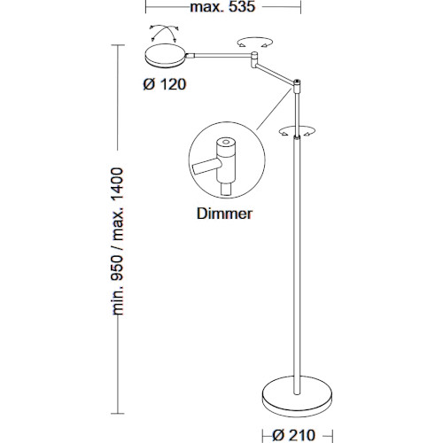 Die schmale Stehleuchte mit ihrem elegantem Design ist von 95 cm bis 140 cm sehr unkompliziert stufenlos Höhenverstellbar. Der Bridgearm ermöglicht es Ihnen eine bequeme Lesehaltung einzunehmen und zu entspannen. Die maximale Ausladung des Armes beträgt ca. 50 cm. Der Lampenkopf ist Drehbar und leicht Abkippbar.